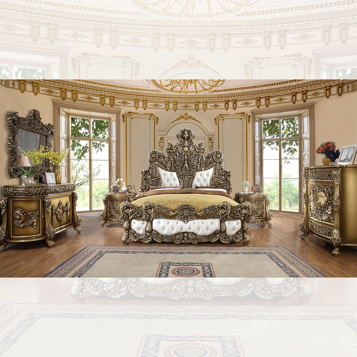 Revamp your bedroom with the HD-1802 Bedroom Set. Drawing inspiration from the grandeur of the Old World, our luxury bedroom collection epitomizes sophistication, glamour, and extravagant luxury. The centerpiece of this collection is the Luxury Ornate Old World Golden Curved Leaf Bed, exuding timeless elegance and unparalleled charm. Create a captivating ambiance in your sleeping area with the traditional charm of the Perfect Brown & Gold Dresser, Mirror, and Nightstands.