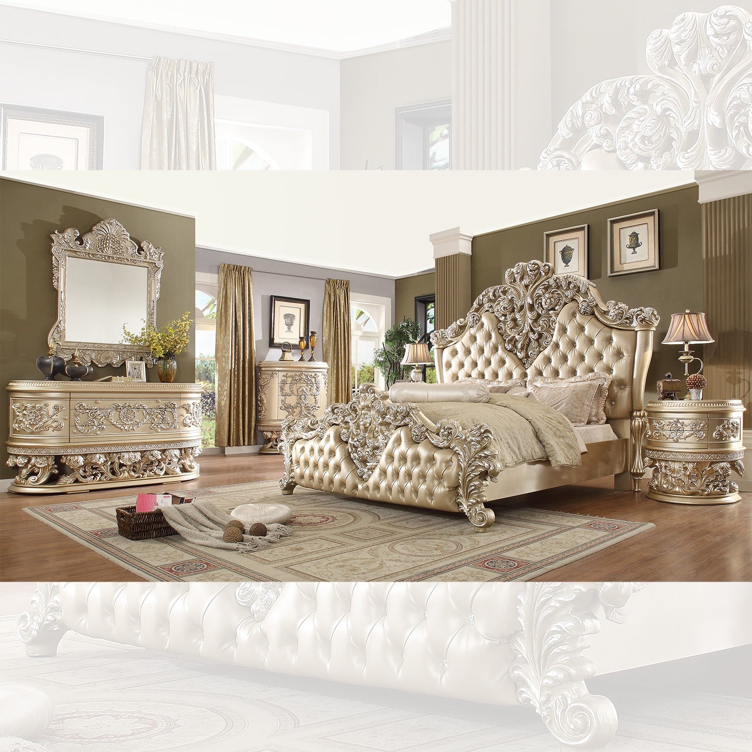 The HD-8022 Luxury Ornate Old World Leaf Bed is a focal point of sophistication, boasting a crystal-tufted headboard and footboard, faux leather upholstery, and intricate tipped scrolling that adds a touch of extravagance. The nightstand and dresser not only provide style but also ample storage for your bedroom essentials.