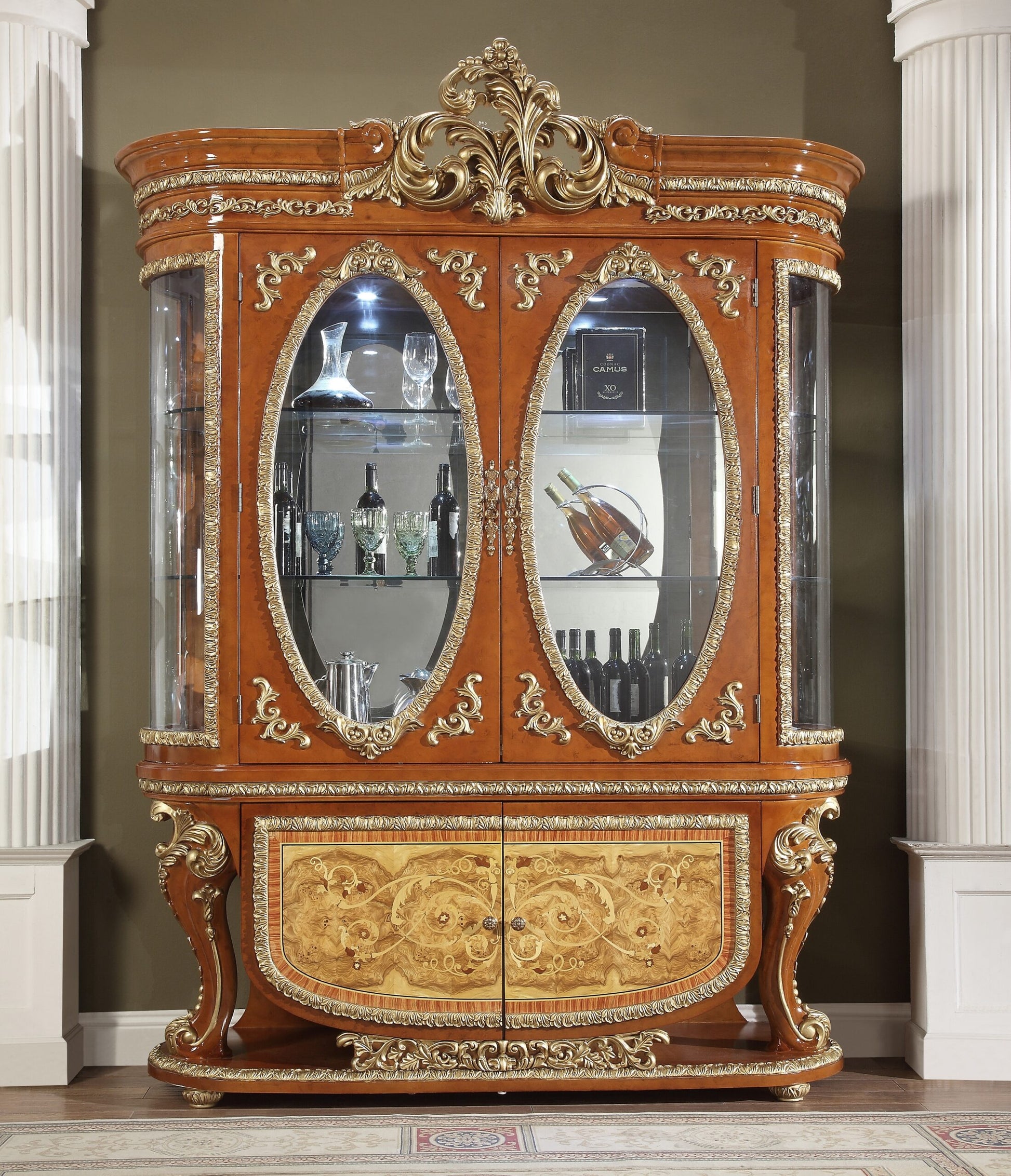 Store your finest china in this stunning china cabinet. Rich cherry finish, metallic gold accents and inlay design set this apart from the rest. Plenty of shelving to showcase your grandest pieces and felt lined top drawers for your finest silver. Finish the dining collection with this stunning piece.