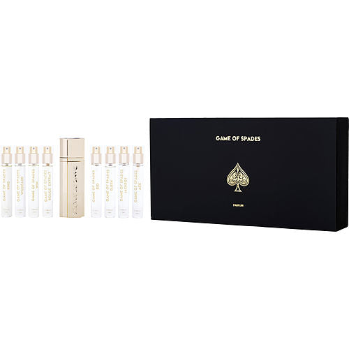 GAME OF SPADES SET WITH KING & WILDCARD & WIN & ROUGE EXTRAIT & ROYALE & BID & QUEEN & JACKPOT & ACE AND ALL ARE EAU DE PARFUM SPRAY MINIS 0.34 OZ