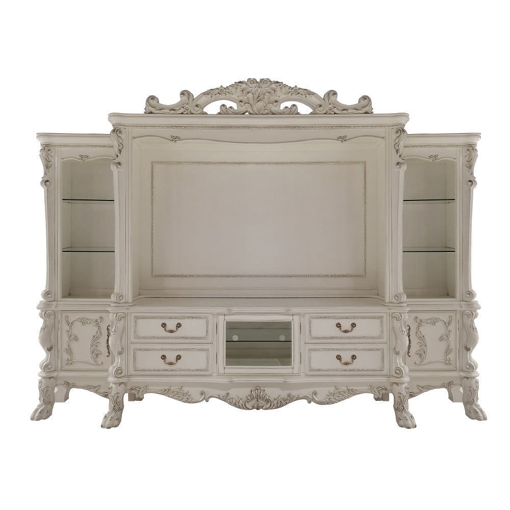 Exclusive DesignEntertainment CenterIncludes: 2 Side Piers & Center HutchStorage: Pier 3 Open Compartments and 1 Wooden DoorTouch Light FunctionMax Size Recommended: 70" Flat Panel TVOversized Scrolled Moldings & Claw Legs with Antique Hand Brushed FinishSold Separately: TV Stand
